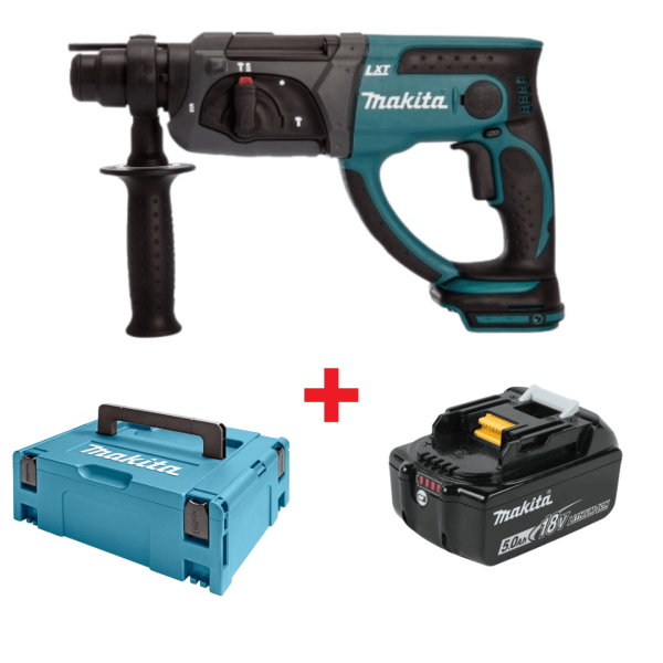 Акумуаторен перфоратор Makita DHR202Z в комплект с една батерия BL1850B (18V, 5Ah) и куфар Makpac.