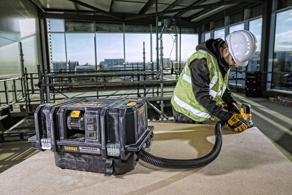 Акумулаторната прахосмукачка DeWALT, DCV586MN е от серията T-STAK M-Class и се захранва с 54 V FlexVolt XR батерия за професионална употреба на строителни обекти. Дебитът й е 1482 л/мин, маркучът е с дължина 2.4 м и диаметър 32 мм, а контейнерът е с капацитет 7.8 л. Дистанционното Wireless Tool Control позволява на потребителя от разстояние да включи прахосмукачката от инструмента. Филтрите се почистват автоматично. Безчетковият мотор с мощност 2000 W осигурява висока производителност и защита срещу претоварване. Звукова сигнализация предупреждава потребителя за намаляване на производителността.