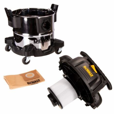 Електрическа прахосмукачка DeWALT DVX20S с мощност 1050 W, предназначена за сухо и мокро почистване, включително и при индустриално ползване.