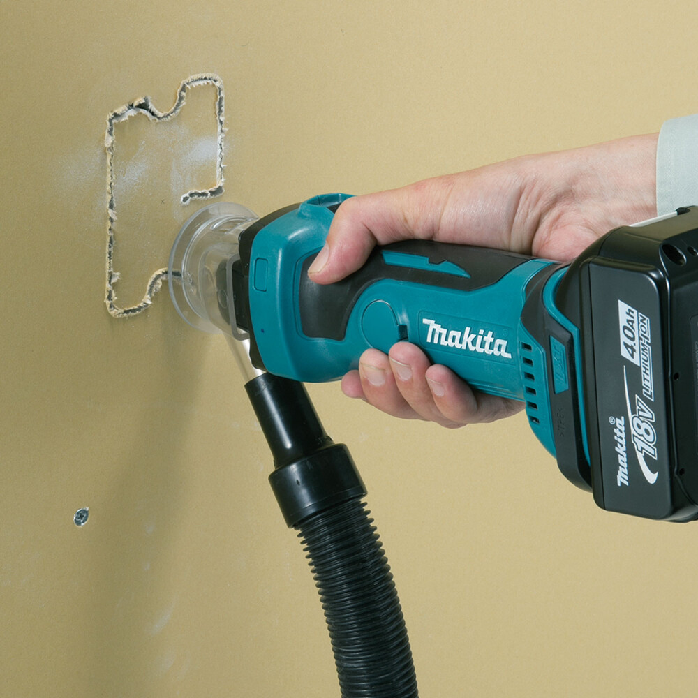 Челната фреза на Makita DCO180Z се захранва с 18 V батерия, а високата скорост на въртене - 30 000 об/мин, осигурява бързо рязане на плоскости гипсокартон.