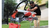 Настолен циркуляр Rubi за водно рязане на облицовъчни материали с дебелина до 35 мм. Максималната дължина на рязане е 850 мм.