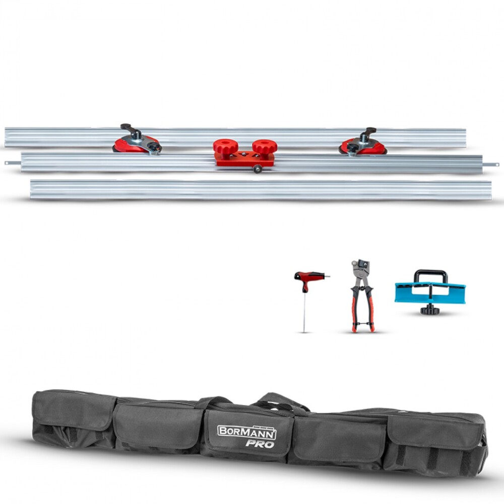 Система за ръчно рязане на широкоформатни плочи BORMANN Pro BTC4550 се състои от три сегмента, които се комбинират, за да достигнат обща дължина от 3.3 м. Подходяща е за рязане на различни стенни и подови плочки. Ролковият нож е прикрепен към механизъм за накланяне, който позволява ролковото острие да бъде избутано надолу. Модулните водачи са изработени от алуминий. Доставя се в удобен сак с аксесоари вендузи 2бр., ключ шестостен 1бр., клещи за отчупване 1бр., уред за отчупване 1бр.
