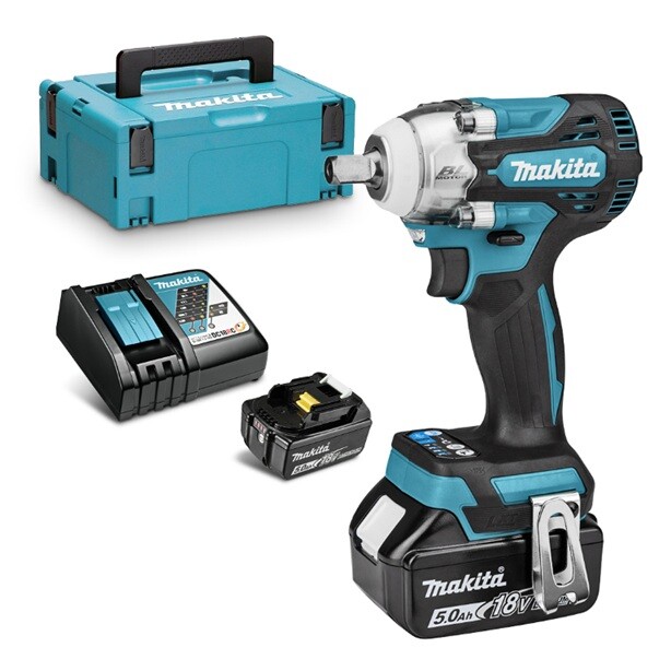 Акумулаторният ударен гайковерт Makita DTW301RTJ е оборудван с безчетков мотор, който се захранва с 18 V батерия, има въртящ момент 330 Nm и захват квадрат 1/2", което му позволява работа със стандартни болтове и гайки М10-М20. Разполага с 4 регулируеми стойности на въртящия момент, 3 режима за затягане на болтовете, което редотвратява пренатягането им, и режим на автоматично спиране при движение на заден ход. Машината спира автоматично веднага, щом болтът или гайката се разхлабят достатъчно или може да се продължи с по-ниска скорост. Оборудван е с променлив контрол на скоростта, функция за максимална скорост - при частично натискане на превключвателя скоростта достига максимума и защита срещу претоварване, прегряване и дълбоко разреждане на батерията. Доставя се с 2 батерии 18 V, 5 Ah и зарядно устройство, в куфар.