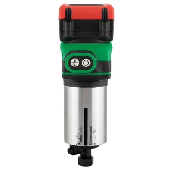 Челната фреза разполага с предпазен превключвател с функция за заключване и блокиране на шпиндела за бърза и удобна смяна на фрезера. Точната настройка на дълбочината на фрезоване позволява прецизно водене и чист резултат, а подвижната лята алуминиева основа осигурява стабилност и плавно движение по обработваната повърхност. В комплекта са включени надлъжен и ролков водач за по-голяма гъвкавост при работа, както и конектор за прахоулавяне за по-чиста работна среда.