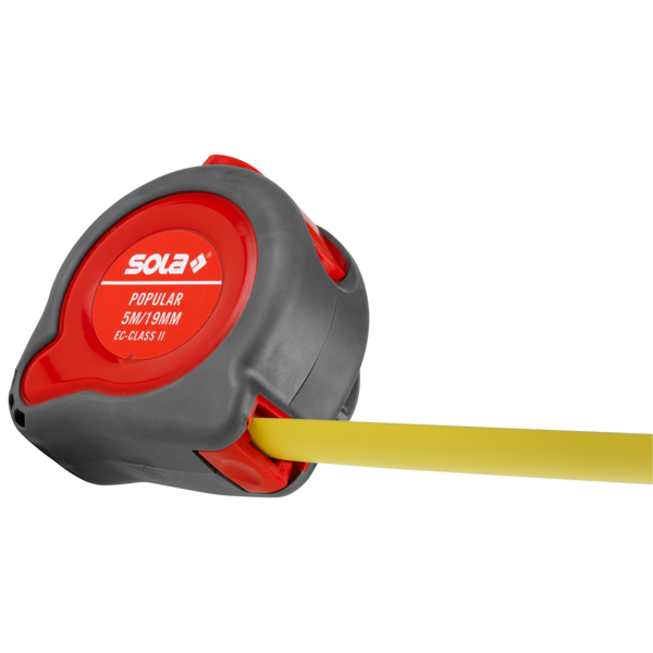 Ролетката на Sola издържа падане от големи височини има система за плавно прибиране на лентата, притежава ергономичен корпус и гъвкав клипс за колан. Гумирана и противоударна, измерващата лента е с дължина и широчина 19мм. Автоматично прибиране на лентата и блокиране на обратния ход.
