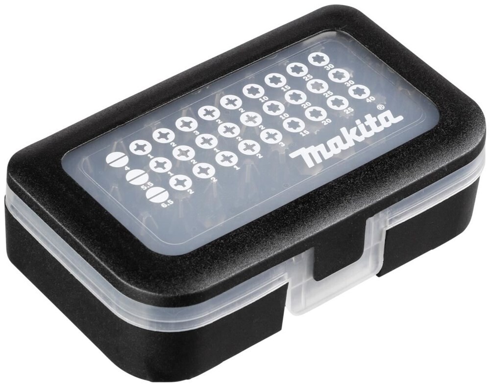 Компактен комплект на Makita, състоящ се от 30 броя накрайници и магнитен държач.