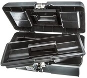 Пластмасова кутия с органайзер в капака. Подходящ за транспорт и съхранение на ръчни инструменти.