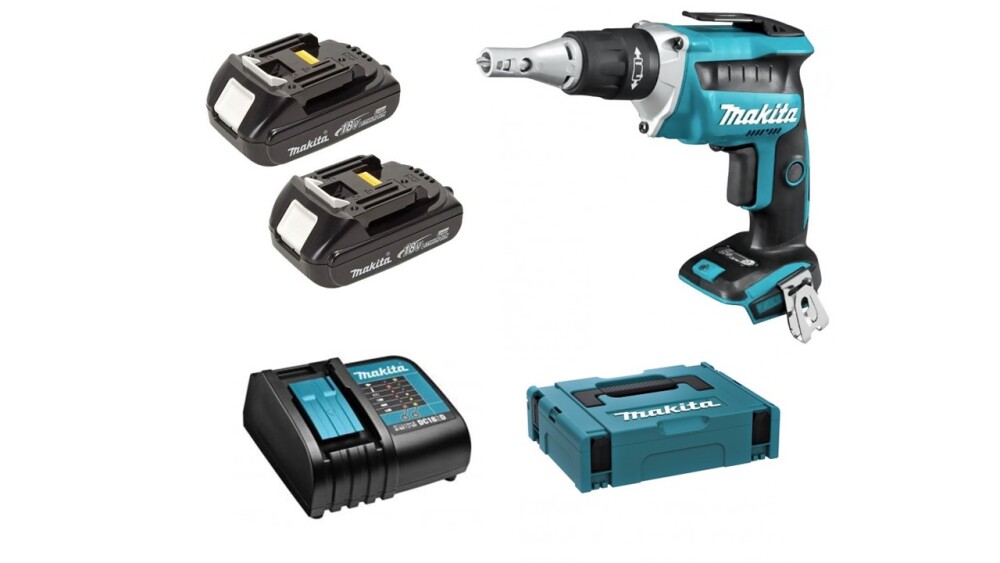В тази окомплектова, винтовертът е оборудван с две батерии 18V, 1.5Ah; зарядно и куфар Makpac.